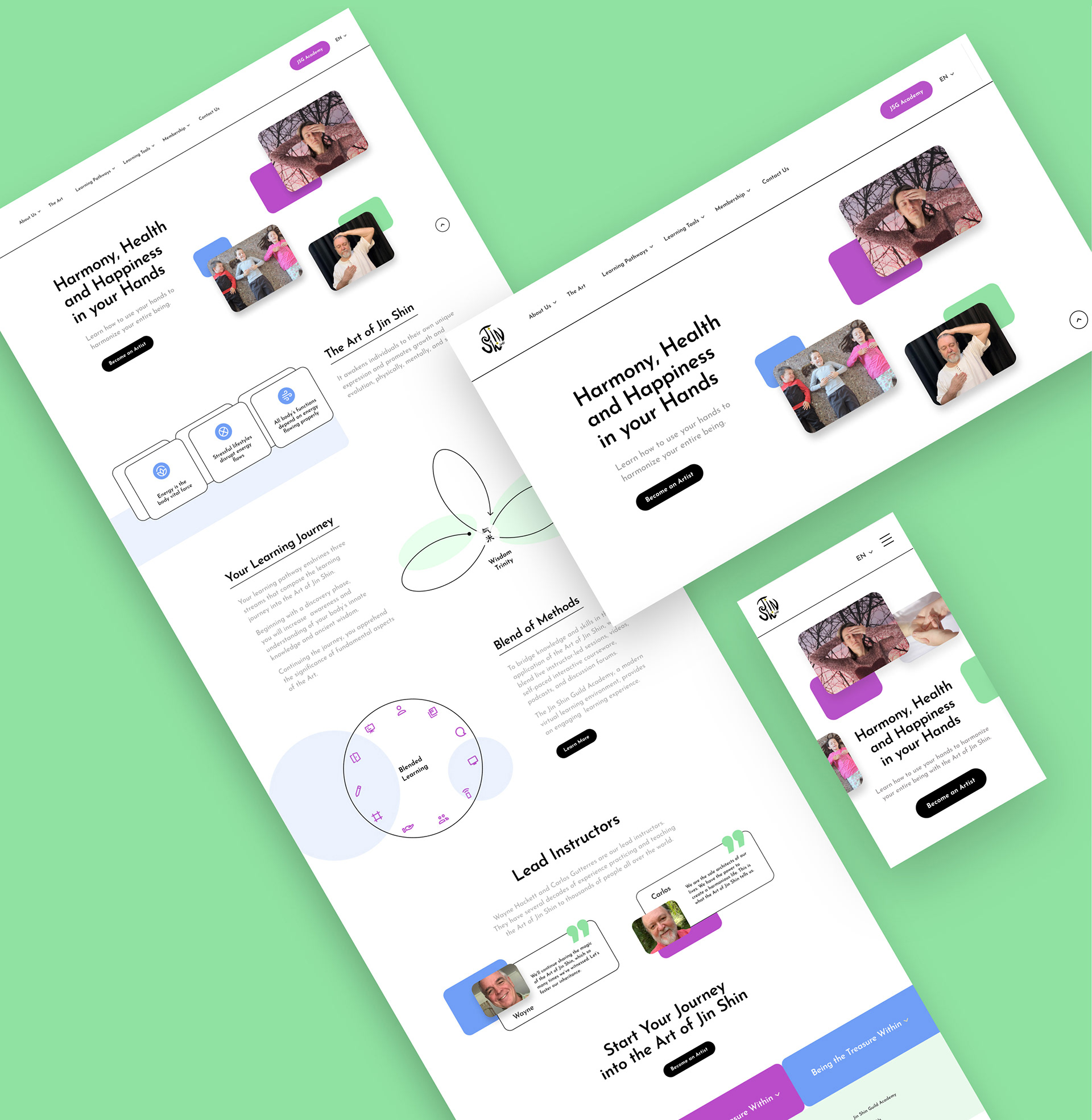 JSG is an academy that teaches and spreads the art of Jin Shin. Content, wireframes and high-fidelity mockups were developed for the responsive website.